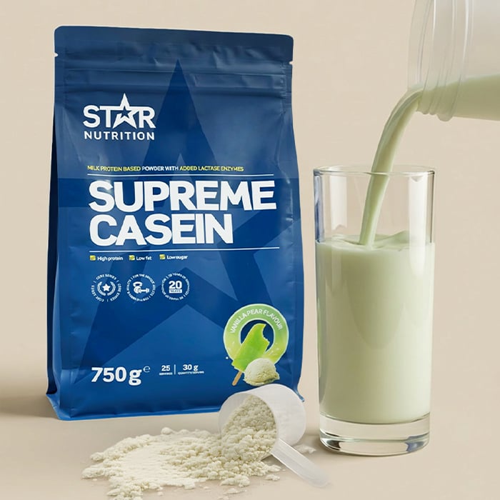 Kasein får en tykkere konsistens end valle og er derfor populært som mellemmåltid eller før sengetid. Supreme Casein fra Star Nutrition er et markedsledende kasein fremstillet af mælkproteinkoncentrat. Et dejligt cremet protein, der giver 25 g protein pr. scoop og indeholder laktaseenzym.